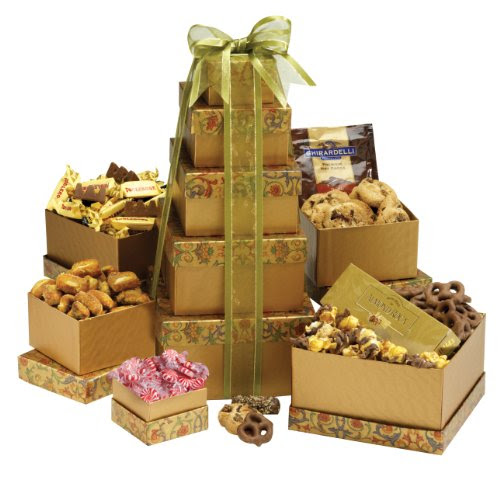 Express your best wishes and tickle the taste buds of friends, family, clients, and associates by sending a Chocolate Heaven Gourmet Gift Tower from Broadway Basketeers. This beautiful gift tower will fit within your budget while offering a sweet treat for the holidays, birthday celebrations, thinking-of-you, sympathy gifts and more.